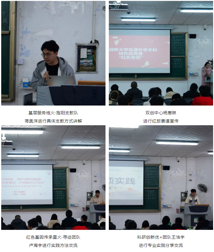 随后,为帮助同学们在社会实践中找准方向、用好方法,实志中心专门邀请到学校优秀实践团队和社会实践先进个人进行经验分享。来自双创红旅赛道的杨惠琳从“上好一堂红色课”“组建一支实践团”“形成一件好作品”“开展一次交流营”四个方面向同学们展示了科创实践活动的全过程;来自星火·寻迹团队的卢海宇为大家分享了团队在基层传承红色基因的实践故事;烛火·旌阳支教队蒋奥洋通过温暖的支教视频向大家讲解了支教实践的意义、途径和方法,激发了同学们的支教热情;优+团队王浩宇分享了利用专业知识为雷波县滑坡提供解决方案的经历,号召大家将专业所学与社会实践相结合助力乡村振兴;以个人形式参加“返家乡”社会实践的李诗璐讲述了自己走进家乡基层开展志愿服务的故事,希望同学们不忘初心,以实际行动点亮公益爱心。