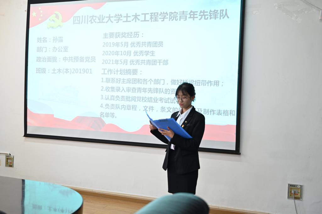 在嘹亮的国际歌声中,答辩正式拉开了帷幕。在答辩过程中,8位竞选人从自我认知、工作规划等多方面进行答辩,对未来做出了详细的计划,面对老师的问题也自信从容应答,充分展现了其思想的先进性及行动的自觉性。答辩结束后,江丽老师提出期望:“希望大家在未来不忘初心,牢记使命,当好榜样,砥砺前行”。本次答辩在老师与同学们的合照中圆满结束。