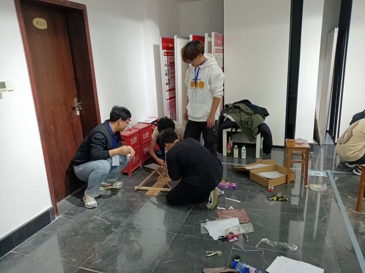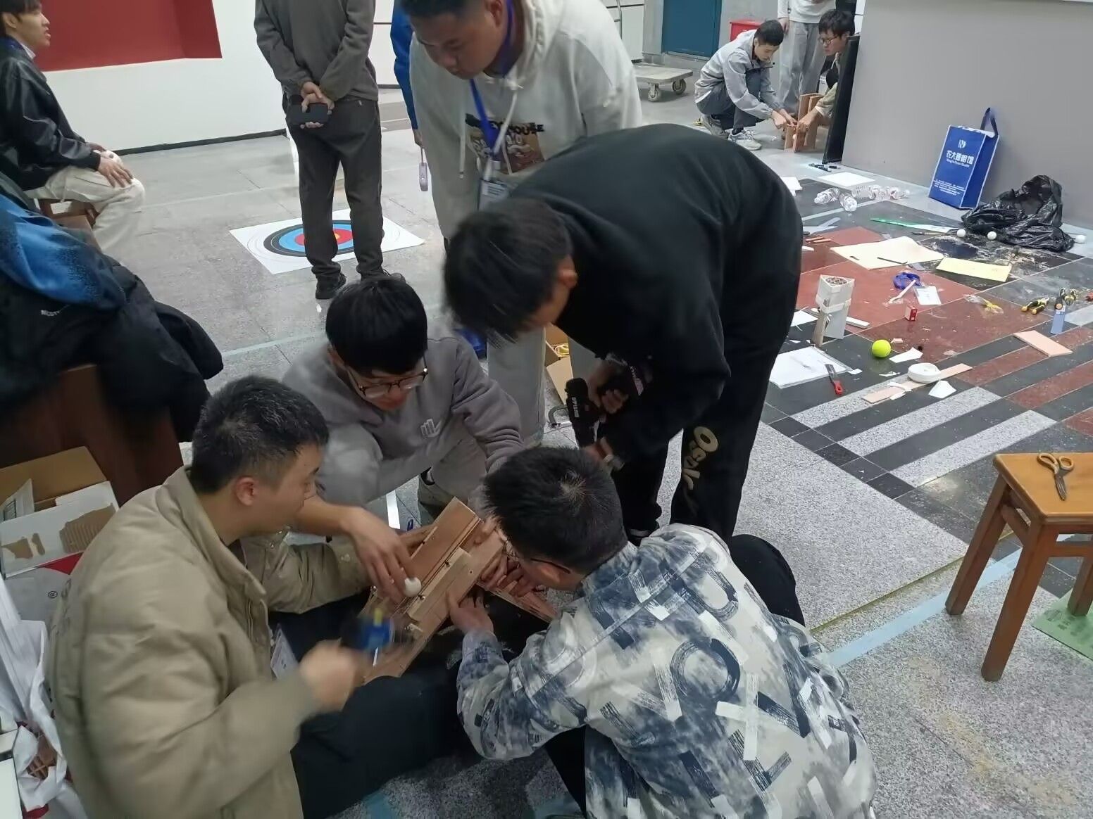 决赛主题为触发式定点投射,通过最终打靶的成绩进行成绩排名。在为期三小时的制作装置与测试阶段,我校三支队伍配合默契,分工明确,均在规定时间内完成装置制作,并充分测试。