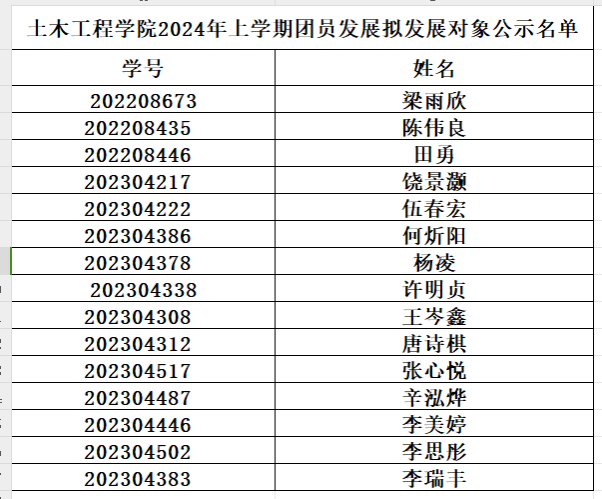 根据校团委《关于做好2024上半年团员发展工作的通知》(校团发〔2024〕8号)、《必赢71886网址登录发展团员工作实施细则》(校团发〔2024〕7号)的文件要求,经学习、提名、院团委对拟推荐的入团积极分子进行预审考察,拟确定何炘阳等15名同学为入团发展对象条件。现将名单公示如下: